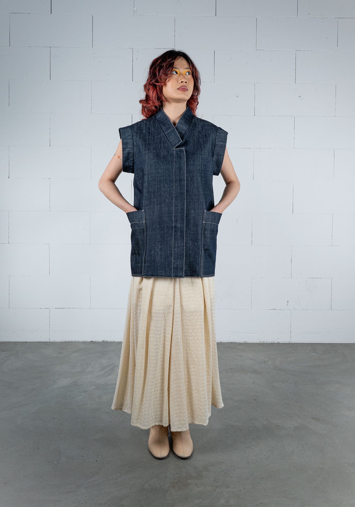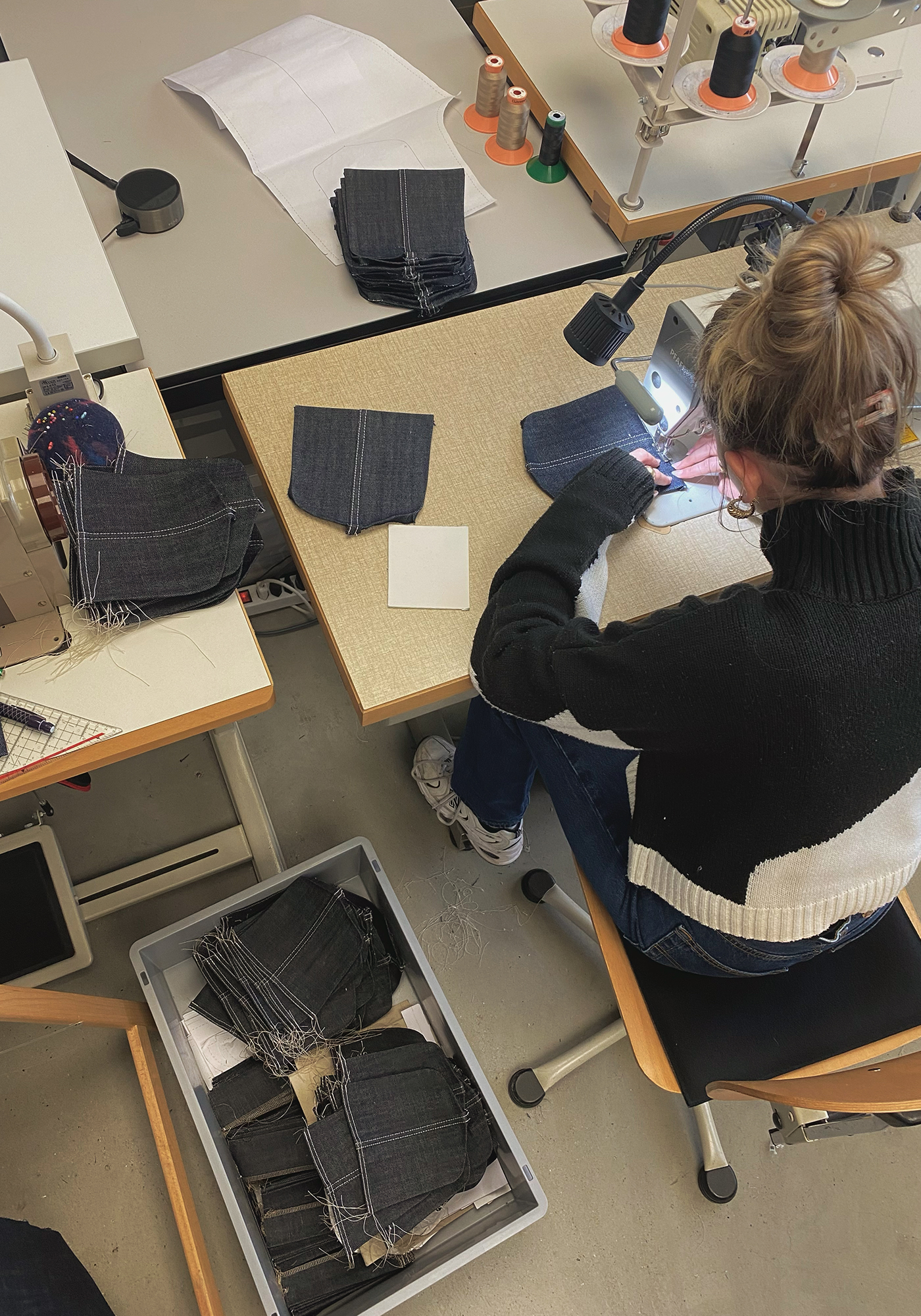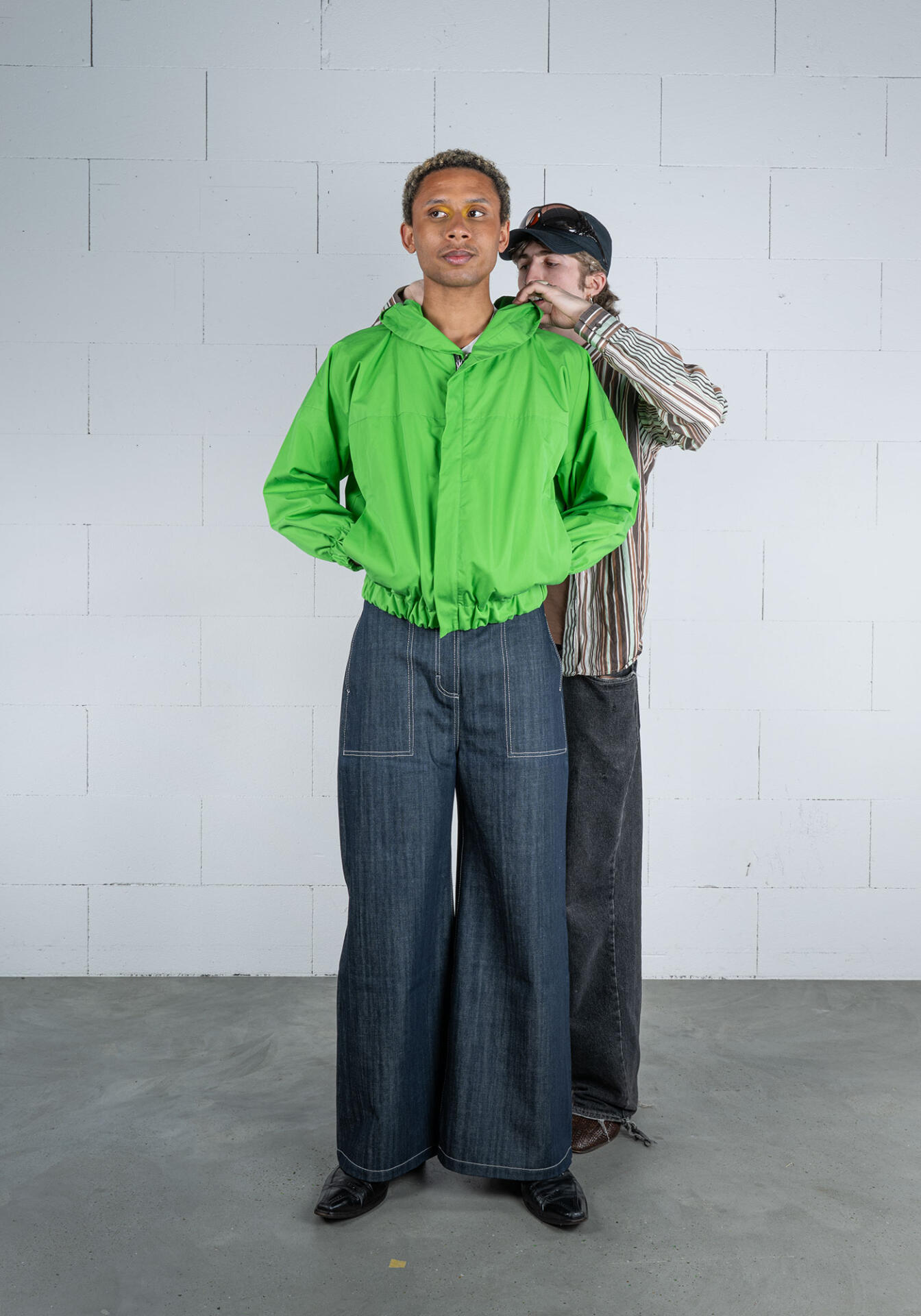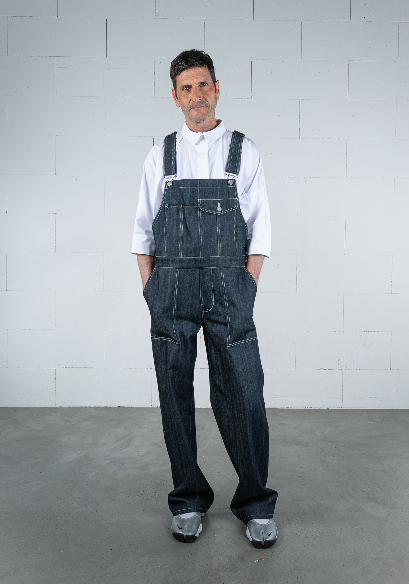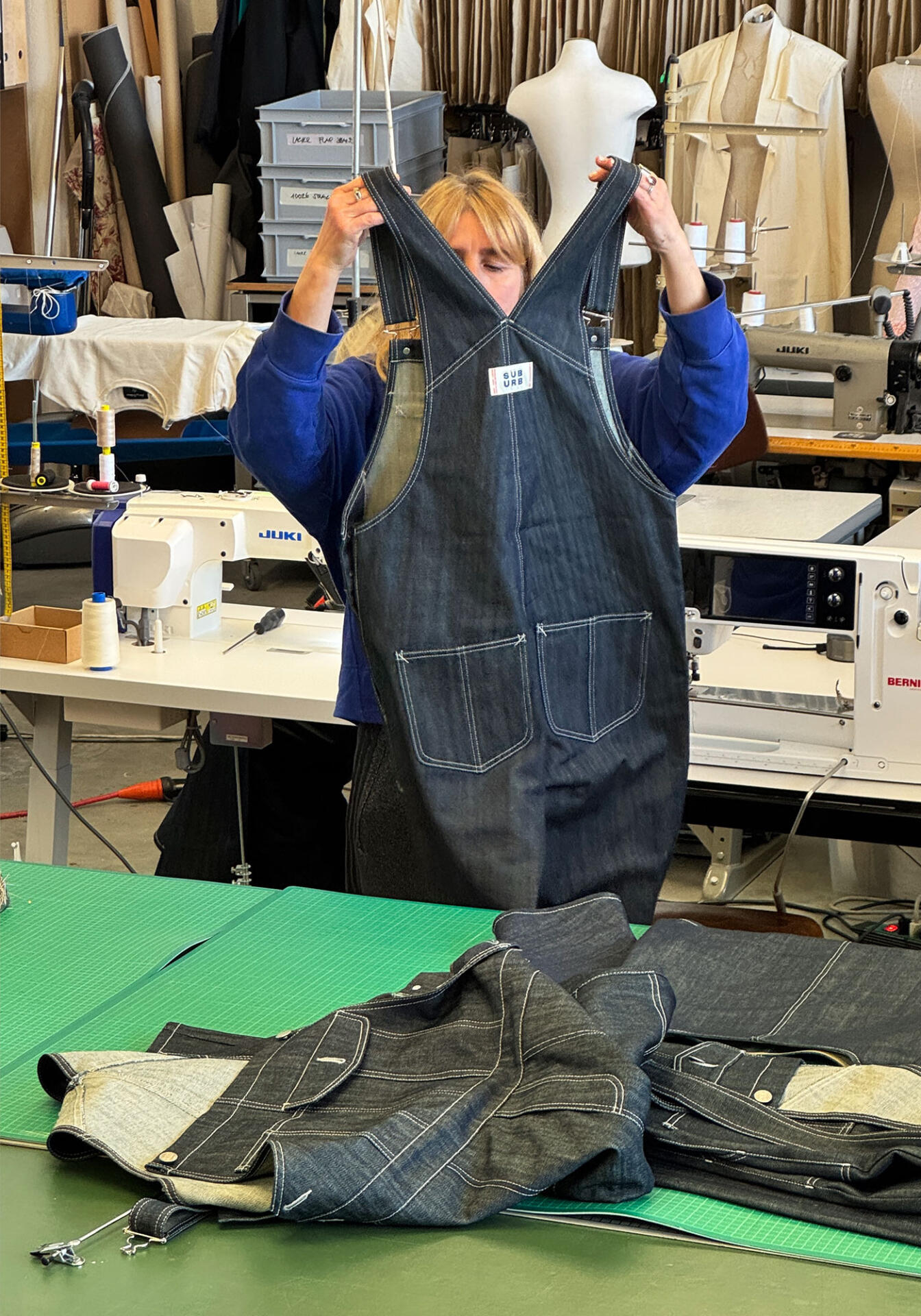 Portenier steht seit jeher für Entwicklung und Produktion unter einem Dach und massgefertigte Entwürfe. Gyger arbeitet ebenso präzis, fertigte bis 2023 Massanzüge für Flachdächer aus Kautschuk und bewegte sich damit jahrzehntelang am Ursprung von Workwear. So ist das Objekt der Zusammenarbeit rasch gefunden: Jeans, ein universales Kleidungsstück, das vor kaum einer Generation und Kultur Halt macht. Aus Lust am Experiment und Freude an der Sache machen die beiden Freigeister Suburb Jeans zum Gegenentwurf zur klassischen Jeansproduktion: Sie stecken den Entwicklungs-, Produktions- und Wertschöpfungsradius bewusst eng, verwenden einzig für die Knöpfe Metall und vernähen den Rohdenim mit Fäden aus recyceltem PET.